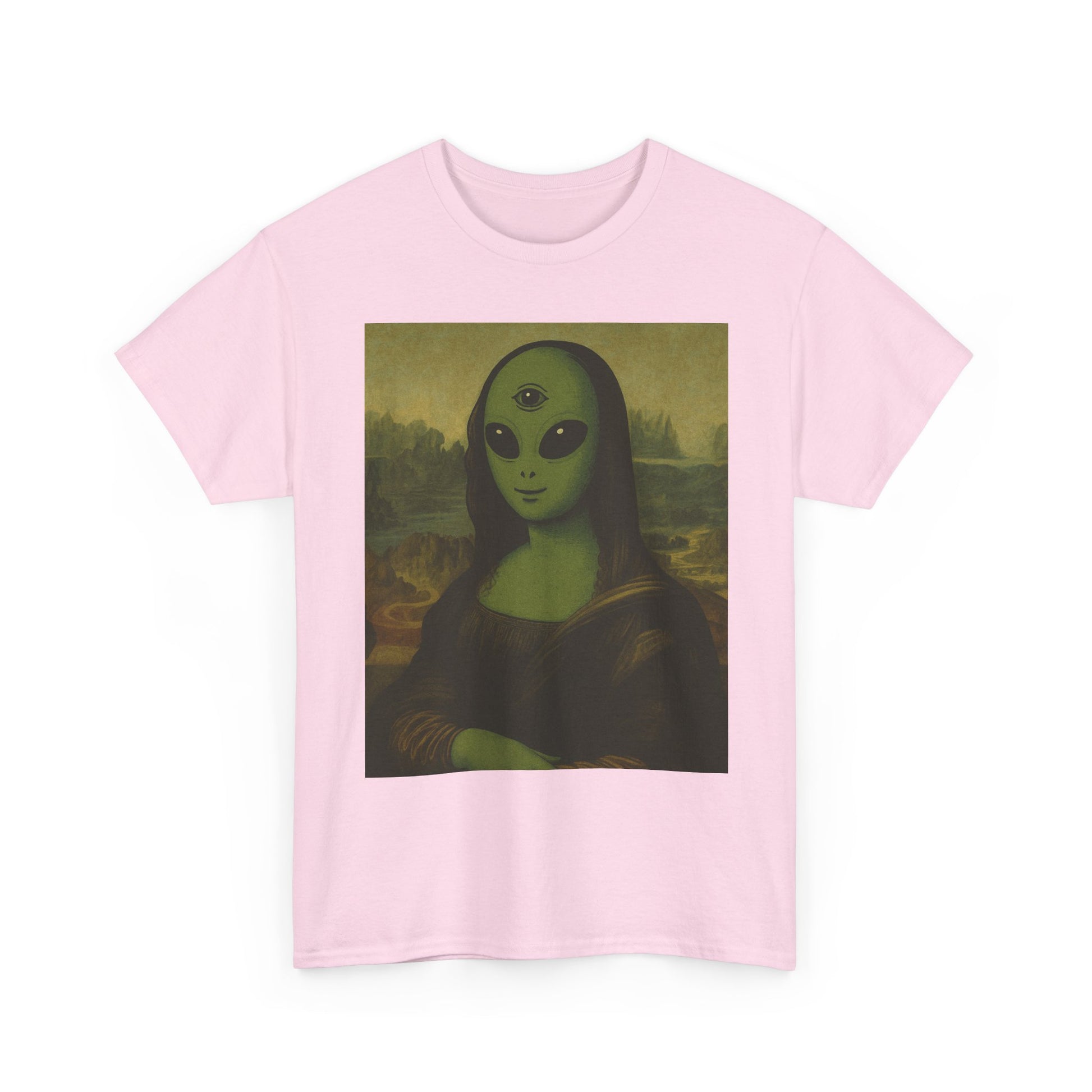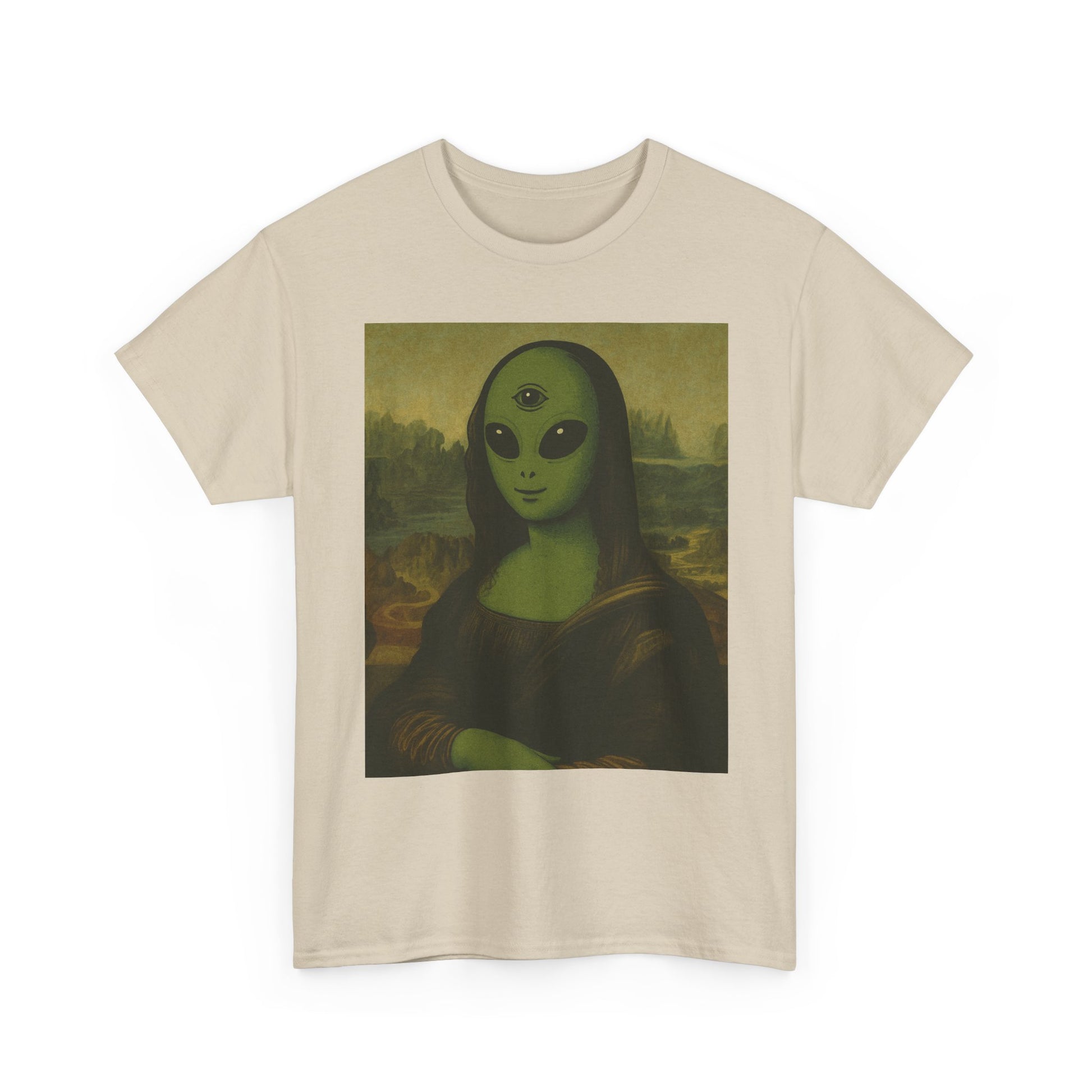 This relaxed-fit cotton tee carries a playful, uncanny twist: the familiar renaissance portrait reimagined with an otherworldly green alien visage. Soft, midweight fabric and a clean crew neckline make it comfortable for all-day wear while the detailed DTG front print keeps the surreal image crisp and vibrant. Wear it when you want to spark conversations at art nights, sci-fi meetups, gallery walks, or casual city hangs. The shirt blends classical art references with low-key extraterrestrial humor — it’s for people who appreciate art history but prefer a cheeky, quirky spin. It layers easily under a jacket or stands alone as the centerpiece of a laid-back outfit. The result feels both nostalgic and playfully strange, the kind of piece that makes friends smile and strangers do a double take.