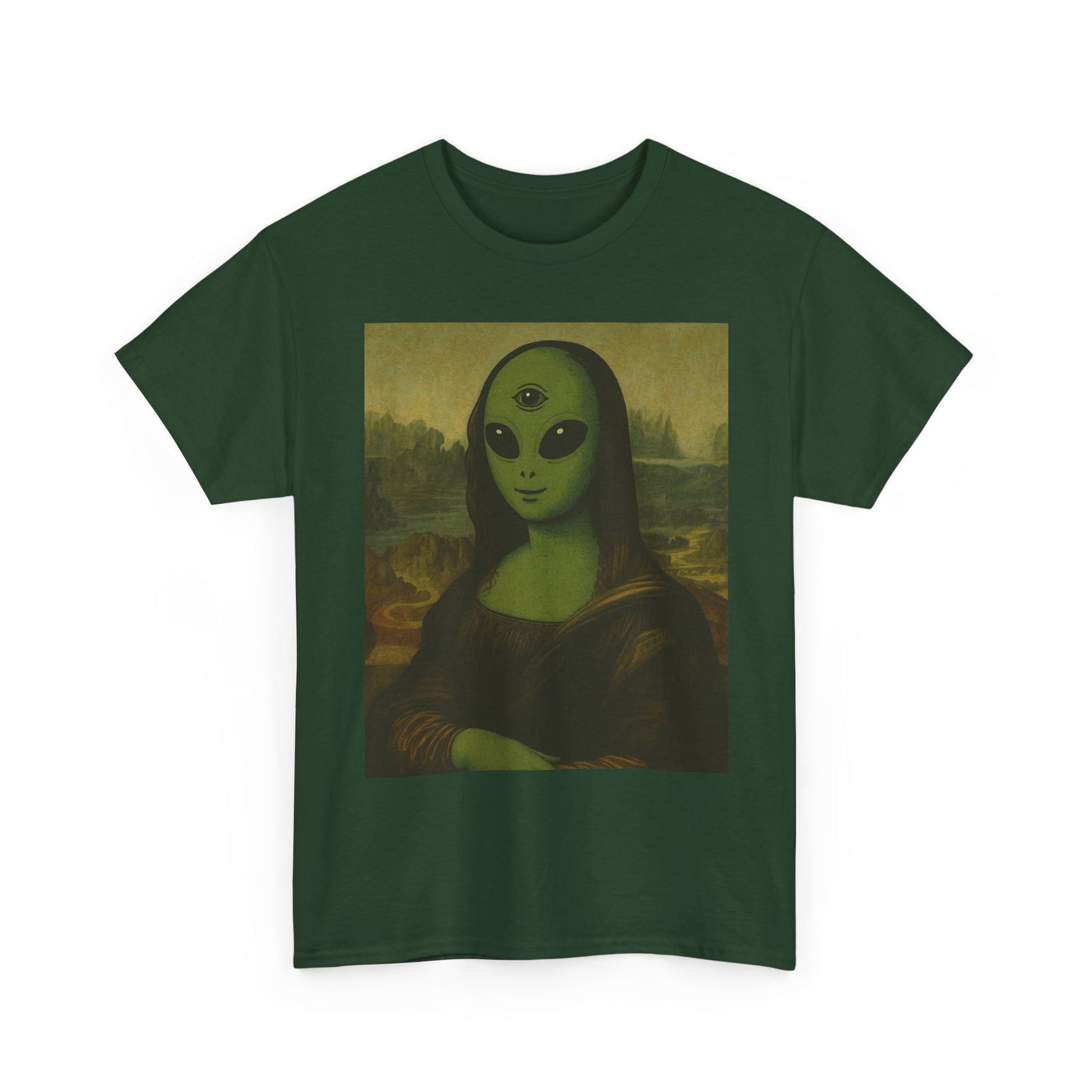 Alien Mona Lisa T-Shirt – Green 3‑Eyed Portrait Graphic Tee